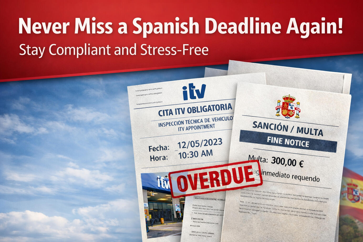 Spanish admin doesn’t forgive missed deadlines. Letters arrive late. Reminders are inconsistent. Fines are not.If you miss ITV, local taxes, or key renewals, fixing it is stressful and expensive.Spain Deadline Shield emails you before deadlines hit — so you stay compliant and avoid penalties.