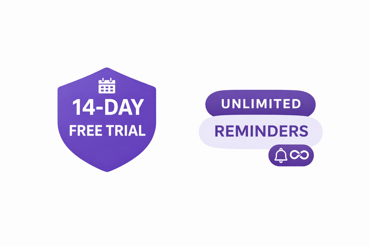 €20 per year 14-day free trial. Cancel anytime.✔ Unlimited reminders ✔ Vehicles, property & personal deadlines ✔ Email alerts before due dates ✔ Cancel anytimeNo contracts. No hidden fees.